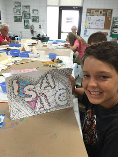 teen camp, I taught how to structure your doodling to make it a piece of art. Everybody doodles, especially in school, in the corner of a notebook, or when bored, so based on the fantastic patterns of the new craze of the Adult Coloring Books, I showed them how to break down an idea (an animal, a landscape, a word, etc) into big shapes and then to fill those shapes with easy repeating patterns to make a great impact and unique piece of art.